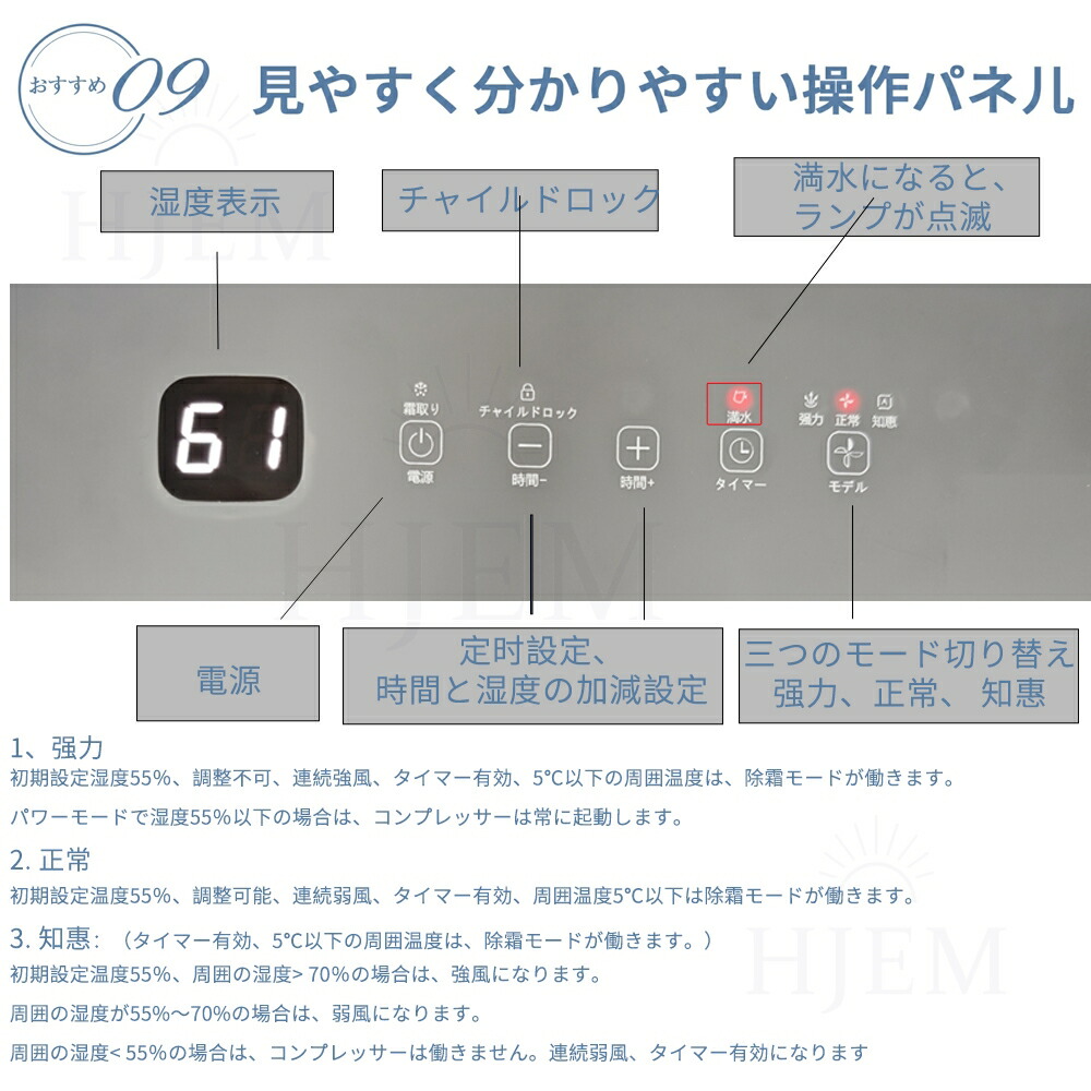タッチパネルで、ワンタッチだけ除湿し始めます。 タイマーボタンをタッチして、12時間のが設定でき、睡眠時や外出時などの時にも安心的に除湿をできます。電源の切り忘れを防げるだけでなく、無駄に除湿をしなくていいので電気代の節約になります。じょしつき 部屋 静音に睡眠モード搭載、運転音が僅か約35dB程度で、深夜の郊外やささやき声レベルの音です。