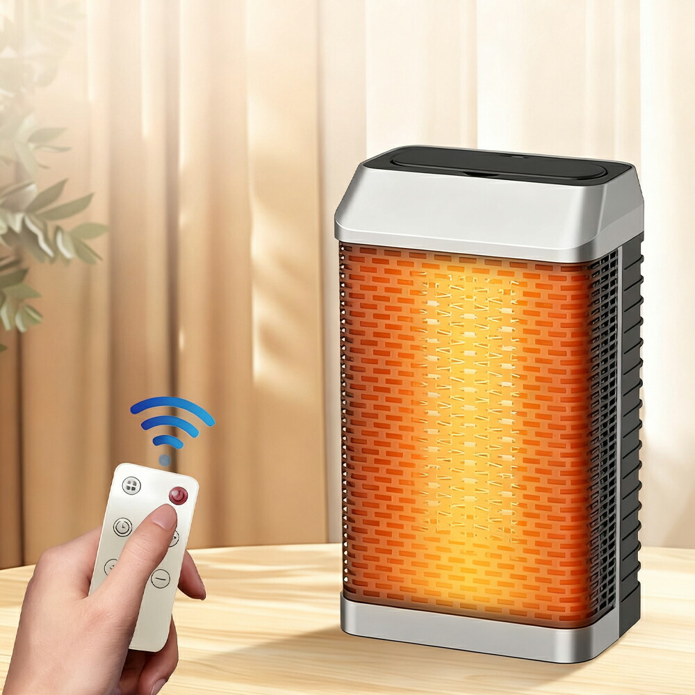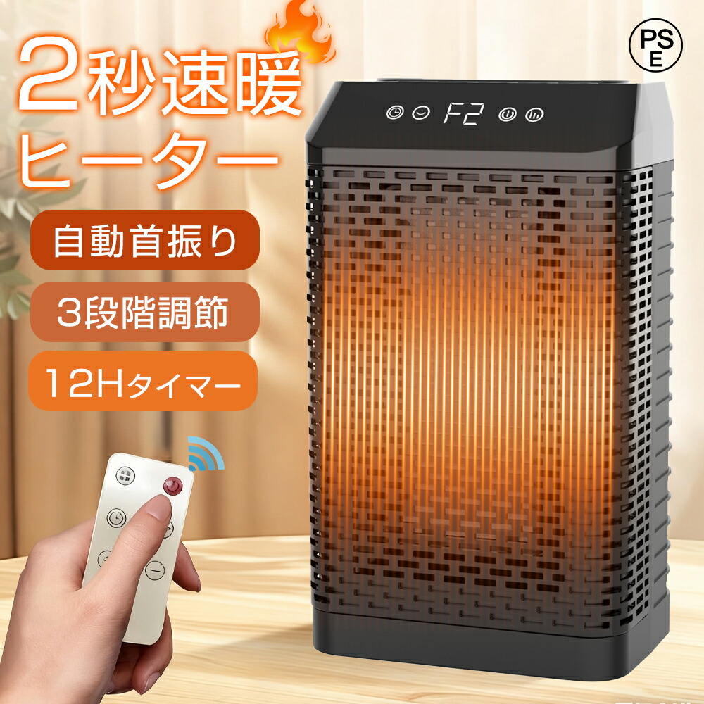 セラミックヒーター 小型 転倒自動OF 機械版 進化版【リモコン付き】 ブラック シルバー