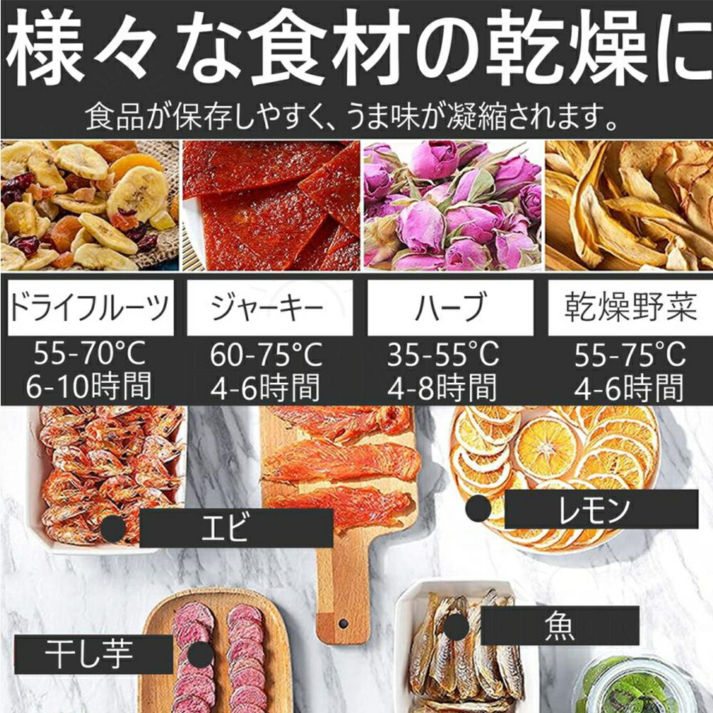 弊社のフルーツドライヤーはプラスチック制フルーツドライヤーと異なり、ファンは底面ではなく背面に配置されているため、各層の食材はより均等に乾燥されます。背面ファン2個付き、360度循環の熱風で全トレイをしっかり加熱します。30-90℃の低温・高温乾燥に対応しています。干し野菜やドライフルーツ、ジャーキー、干し芋、ヨーグルト作りなど様々な食品の乾燥を行うことができます。