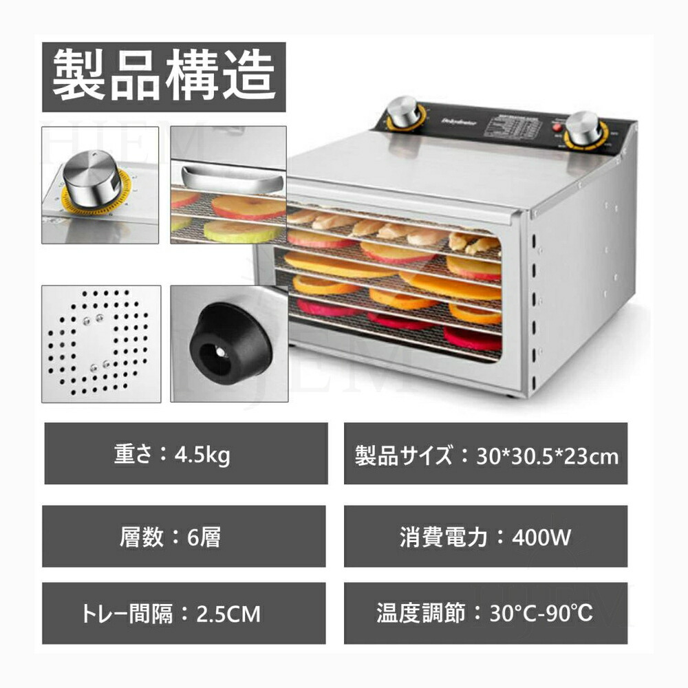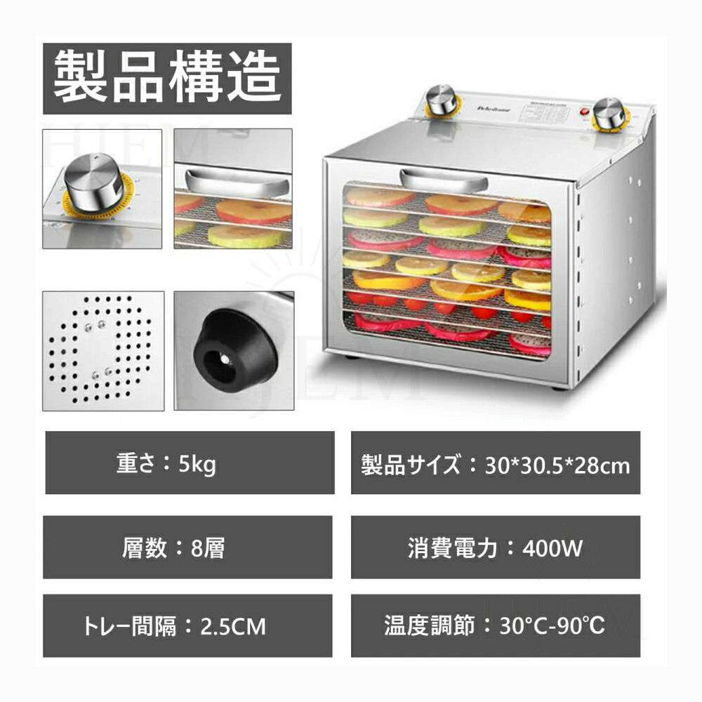 弊社のフルーツドライヤーはプラスチック制フルーツドライヤーと異なり、ファンは底面ではなく背面に配置されているため、各層の食材はより均等に乾燥されます。背面ファン2個付き、360度循環の熱風で全トレイをしっかり加熱します。30-90℃の低温・高温乾燥に対応しています。干し野菜やドライフルーツ、ジャーキー、干し芋、ヨーグルト作りなど様々な食品の乾燥を行うことができます。