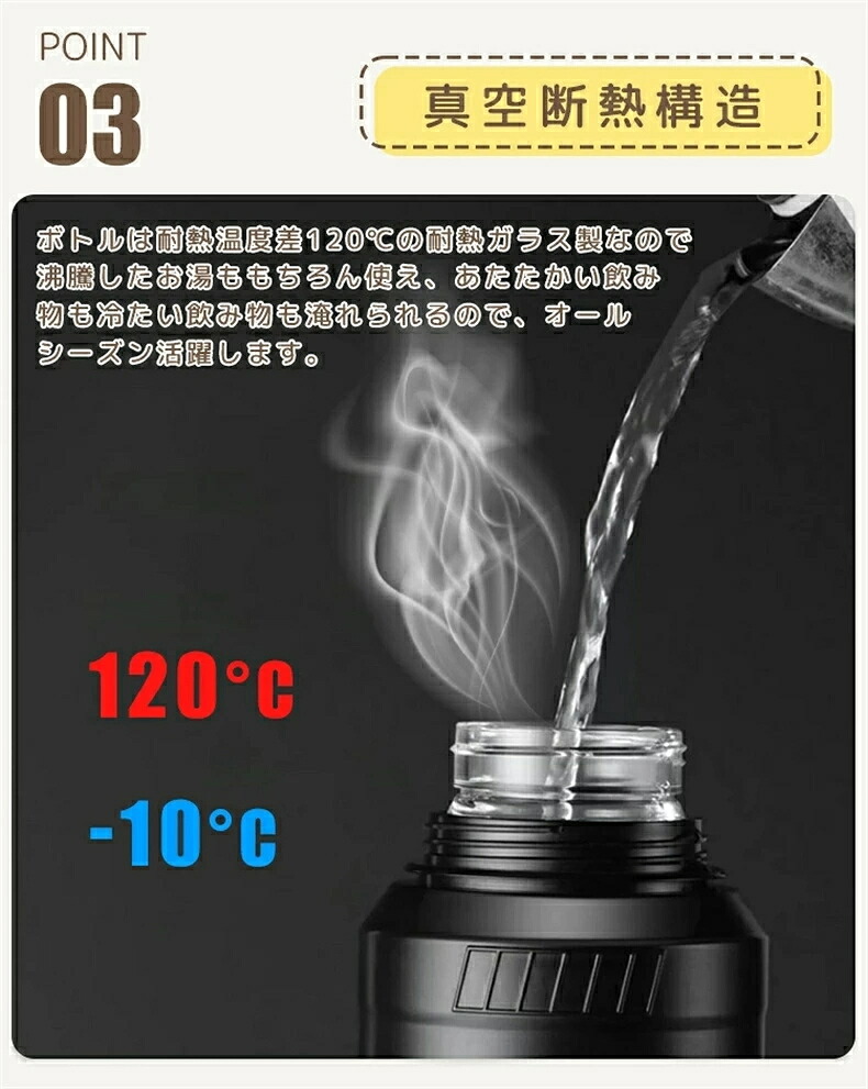 ◆ 内びんは耐熱ガラス製なので沸騰したお湯ももちろん使え、温かい飲み物も冷たい飲み物も入れられます。