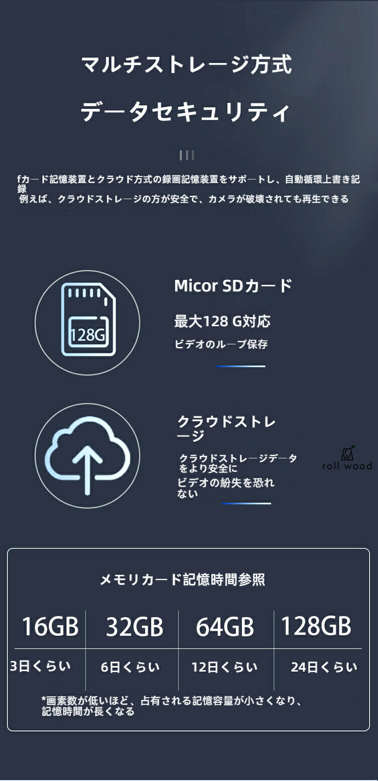 内蔵カード:最大128GBTFカードをサポート(24日間録音可能)