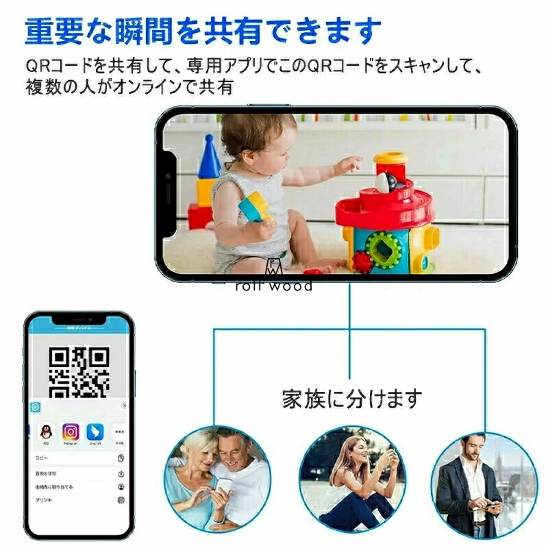 ・共有可能(カメラのQRコードを共有して、専用アプリでこのQRコードをスキャンして、複数の人がオンラインで共有。家族でカメラの録画を共有する事も可能です。