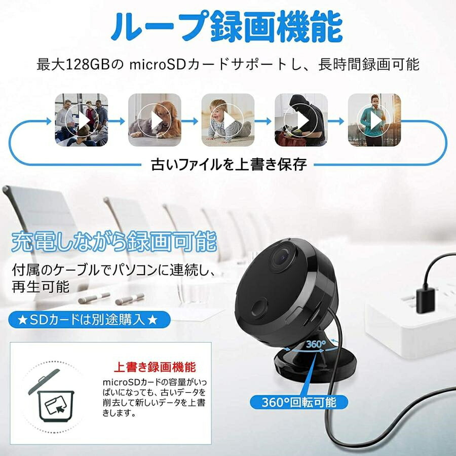 機能:APモード、遠隔監視、ビデオ撮影、WiFi対応、スマホ対応、夜間撮影、動体検知、160°広角監視、1080P、音声記録 給電方式:USBケーブル給電、バッテリー給電(約30分監視可能)
