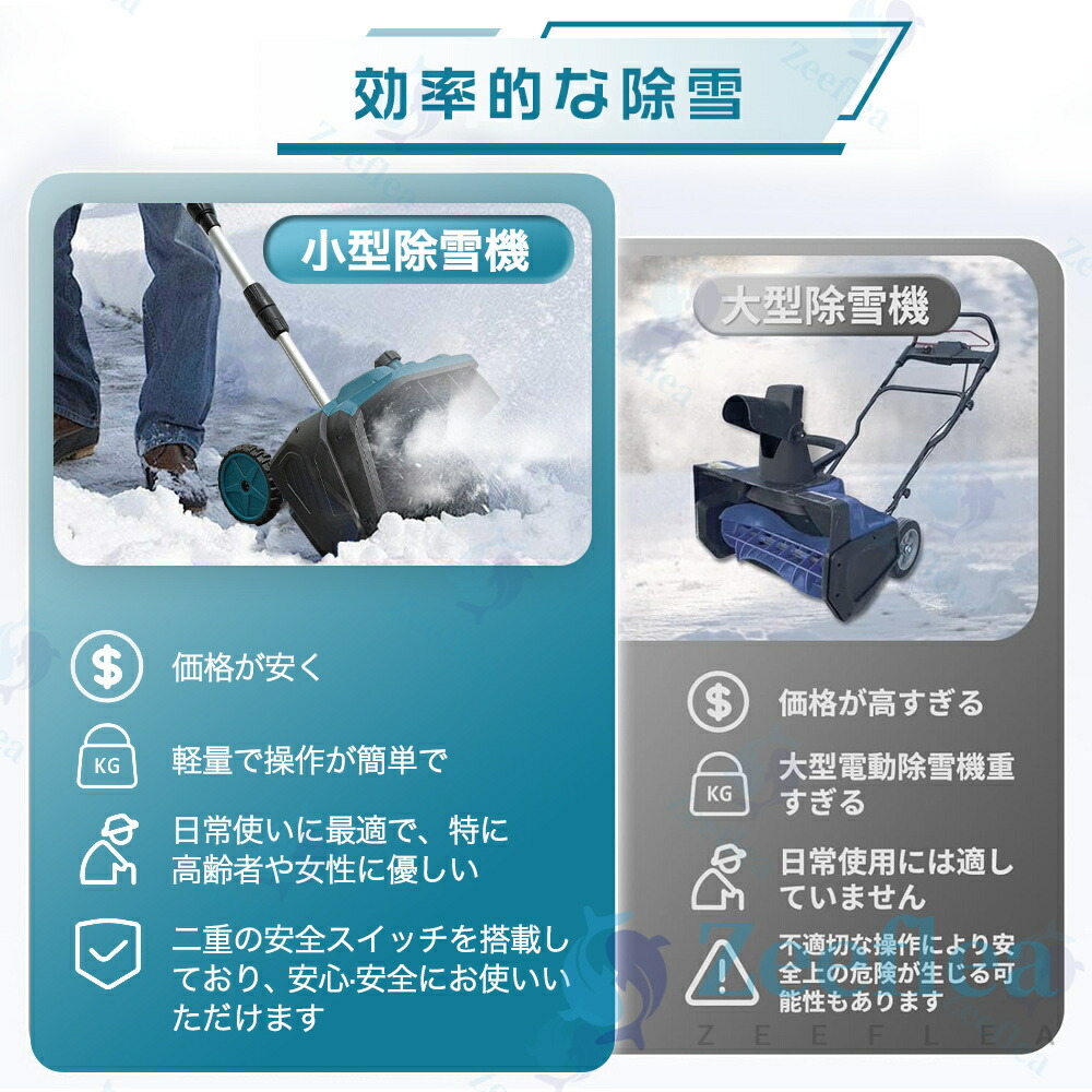 この電動除雪機は、30cmの除雪幅と17cmの除雪深さで、大部分の積雪を効率的に取り除くことができます。家庭用に最適な除雪機として、道路や車道、小規模な商業施設、学校、住宅地など、あらゆる環境に対応します。従来の手動スコップや除雪スコップ 電動と比較して、電動除雪機 スコップは作業効率を大幅に向上させ、時間と労力を節約できます。電動除雪機を使用することで、広範囲の除雪作業も簡単にこなせます