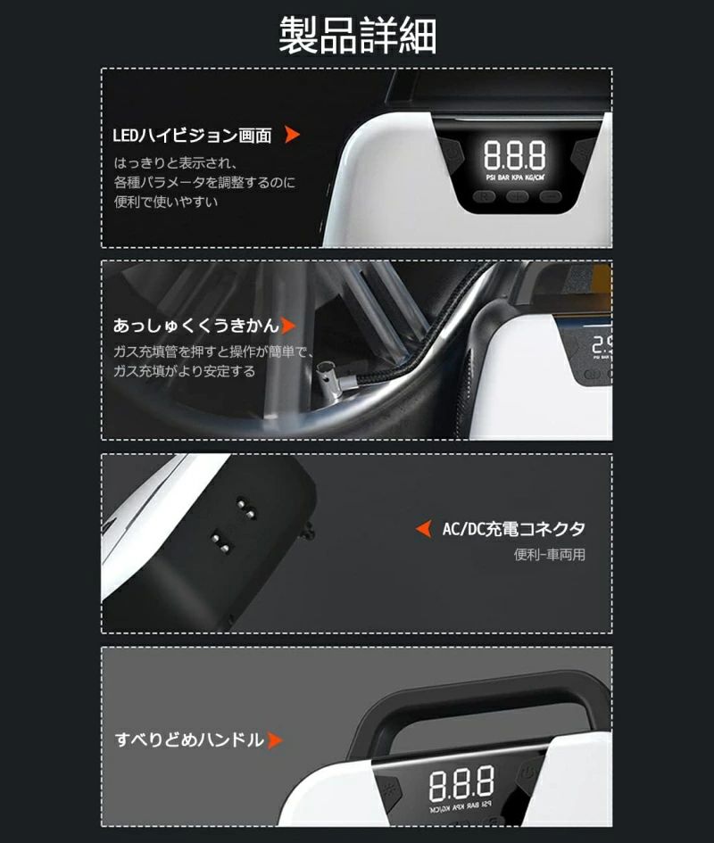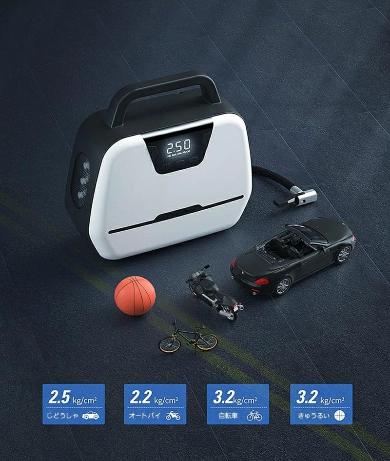 ヤ空気入れ LEDライト 自動停止 パワー・バンク搭載 空気圧指定可能 LCDデジタル表