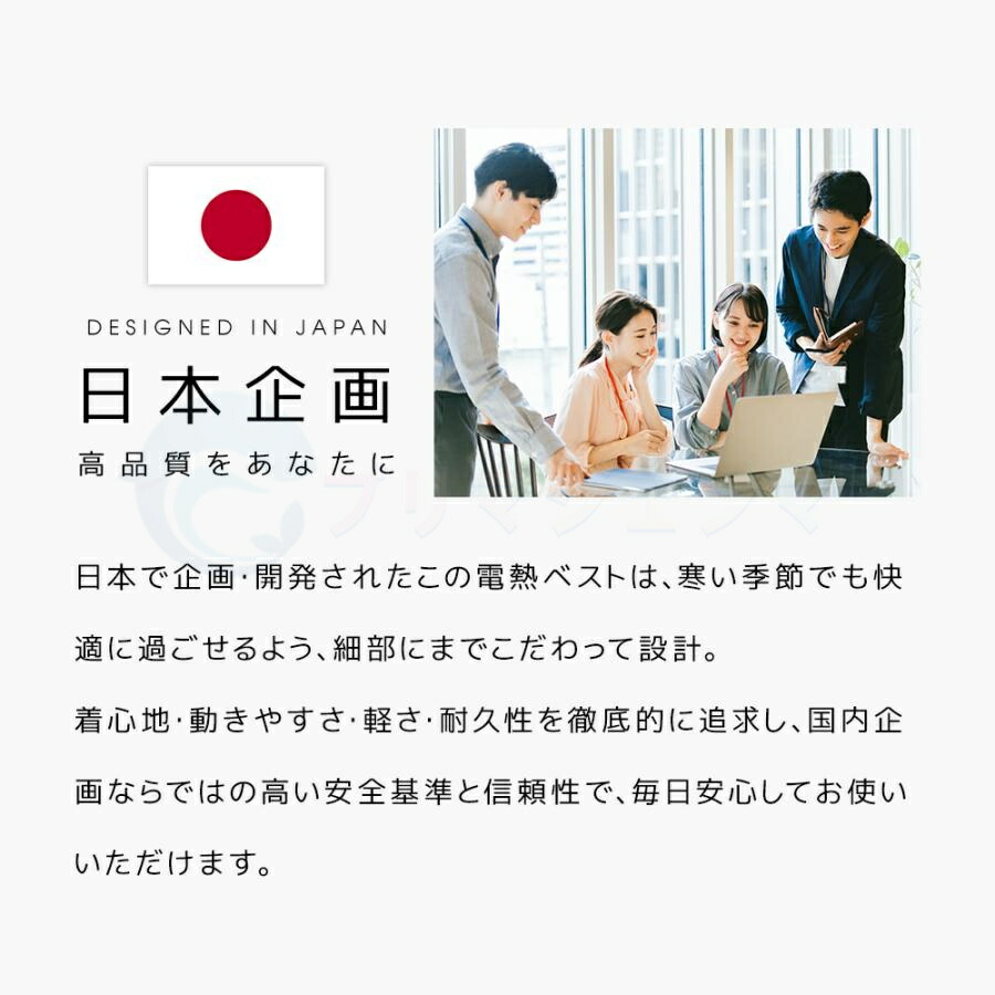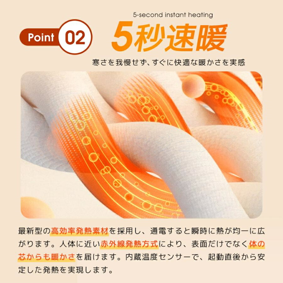 日本製グラフェン繊維ヒーターを採用し、電源を入れた後、約5秒ぐらい温まり始め、30秒ほど暖かさが広がります。加熱ベストの中身には中綿入り、ヒーターとの組み合わせで熱を逃さず、重ね着では得られない確実な暖かさを与えます。約3秒で発熱スタート。首 肩 前面 背面の4箇所から温めたい部分をお好みで選択できます。 赤ランプ 高温(65℃)白ランプ 中温(55℃)青ランプ 低温(45℃)グリーンランプの3段階から温度設定ができ、ボタンの色で温度段階が一目で分かります。