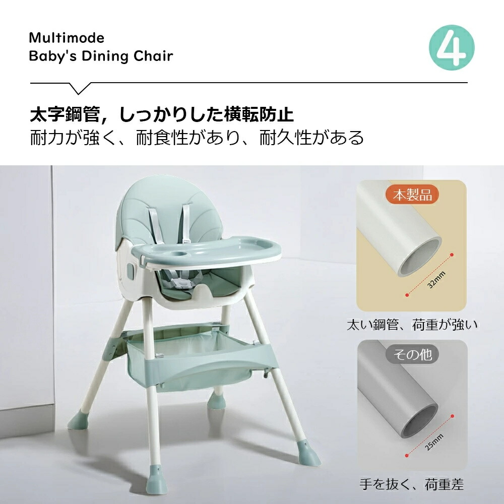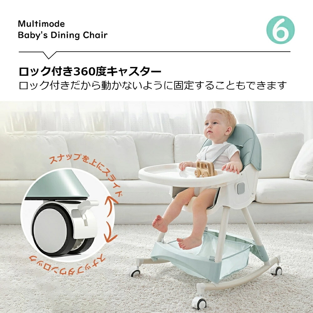 2.工具不要でハイチェア 、ローチェアの2wayで使える。2タイプ・多機能ハイローチェア:足の調節でハイチェアにもローチェアにも変身できる一台二役の機能的ダイニングチェア。また、ハイチェアとローチェアの両モードにそれぞれキャスターを取り付けることができ、移動便利です!5カ月頃から4歳頃まで長くお使いいただけます。