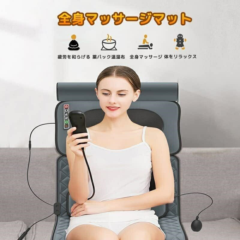 人間工程学に従って、マッサージクッションの外観が中部凹面曲線に設計されて、全身の周りをよくフィットし、サポートします。凹面抱き寄せる設計で、体の形をよく固定し、腰椎曲線を維持し腰部の圧力をリリースします。先進的、安全的な牽引原理や指圧風マッサージと合わせて、体の曲線に合わせて、腰の周りによくフィットして、腰部の圧力をリリースし、簡単的に操作できます。しかも、おしゃれな外観、高級感がいっぱいあって、ご両親、親友、上司などの最優選プレゼントです。 全身マッサージパッド-温め式振動枕マッサージ器 肩と背中の痛みからストレスと緊張感の振動を緩和します。全身マッサージパッドは暖かいマッサージを提供します。 背中の肩と腰、あなたの組織と筋肉をリラックスさせます。一般的な使い方-マットレスはベッド、ソファー、ソファー、寝椅子、椅子の上でマッサージを楽しむことができる柔らかい折りたたみ式です。 マッサージパッドにはリモコンがあり、横になって目的の機能を設定できます。リモコンはマッサージクッション側のストレージバッグに格納することができます。