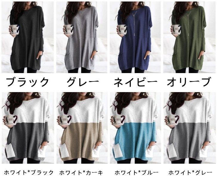 着痩せ ロンT 長袖 チュニック 秋物 レディースファッション 早い者勝ち ブラック ネイビー グレー オリーブ ホワイト*ブラック ホワイト*カーキ ホワイト*グレー ホワイト*ブルー S M L XL 2XL 3XL 4XL 5XL