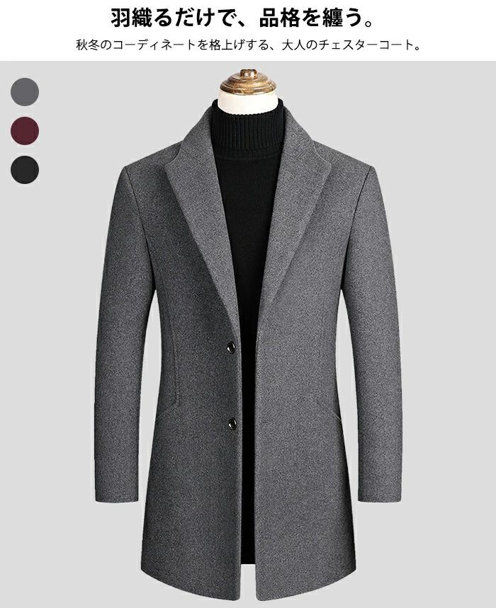 チェスターコート メンズ ビジネス コ メンズファッション 新作 ダークグレー ブラック ワインレッド M L XL 2XL 3XL