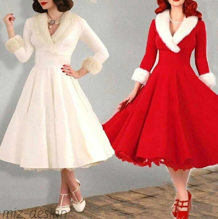 クリスマスドレス ファー Vネックドレス レトロドレス 膝丈 フレアドレス 細身 クリスマス ドレス 大きい裾 パーティードレス コスプレ