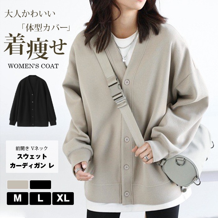 スウェット カーディガン レディース 前開き Vネック トレーナー トップス ビッグシルエット ジャケット カットソー 秋 春 長袖 薄手 羽織り 大人 大きいサイズ 体型カバー 着痩せ ボ ゆったり