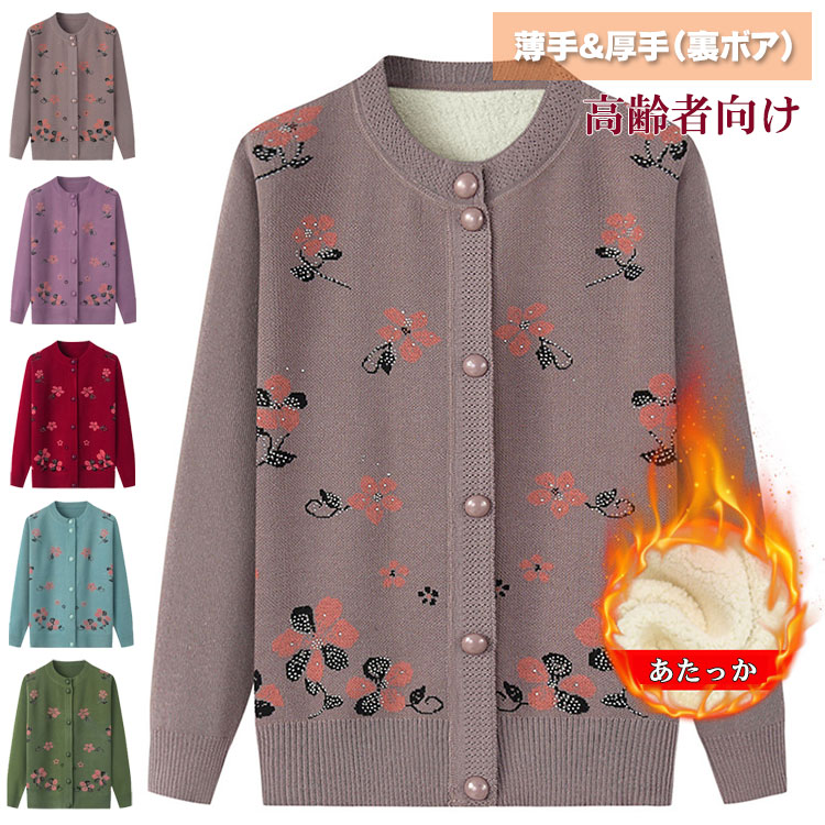高齢者向けカーディガン婦人春秋冬レディース薄手裏ボア2タイプあたたかい羽織りニットジャケットおばあちゃん祖母60代70代80代90代シニアファッション誕生日クリスマスギフトプレゼント5色XL-4XL
