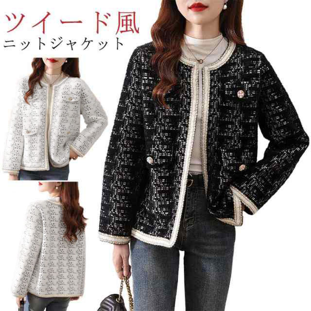ツイード風ニットジャケット ニットカーディガン レディース ノーカラージャケット