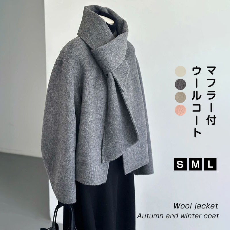 ウールコート マフラー付き ノーカラージャケット レディース ショートコート アウター ラシャコート 冬 卒業式 通勤 ビジネス 防寒 羽織り カジュアル エレガント オフィス チェスターコート