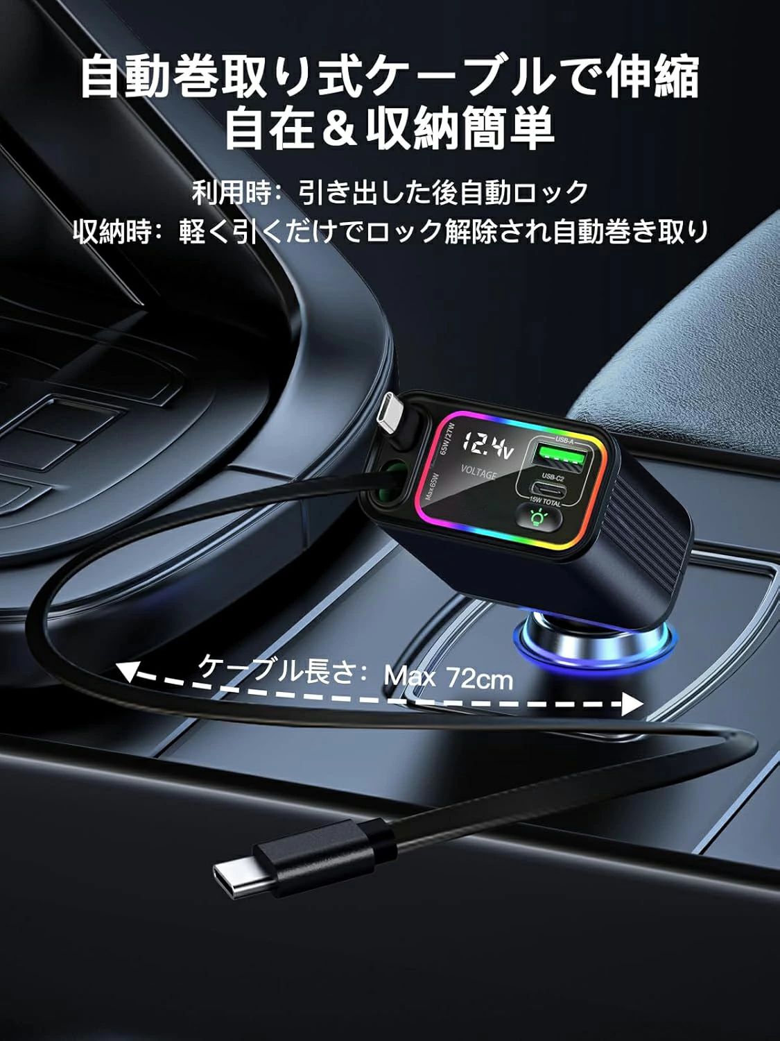 4台同時充電 109W 車 充電器 シガーソケット usb-c 急速充電 4in1 カーチャージャー シュガーソケット 巻き取り式充電ケーブル 車載充電器 2本 カラー LED付き 電圧 Type-C