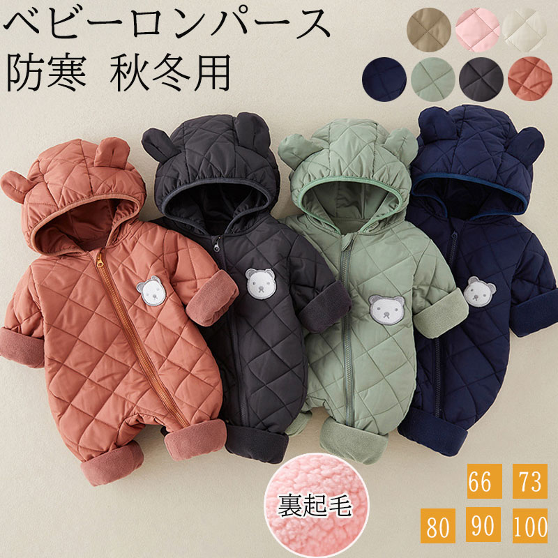 ジャンプスーツ ベビー カバーオール 耳付き くま耳 フード付き 中綿 裏ボア 裹起毛 アウター ロンパース 女の子 男の子 ベビー服 新生児 子供服 キッズ 長袖 出産祝い 雪遊び 撥水