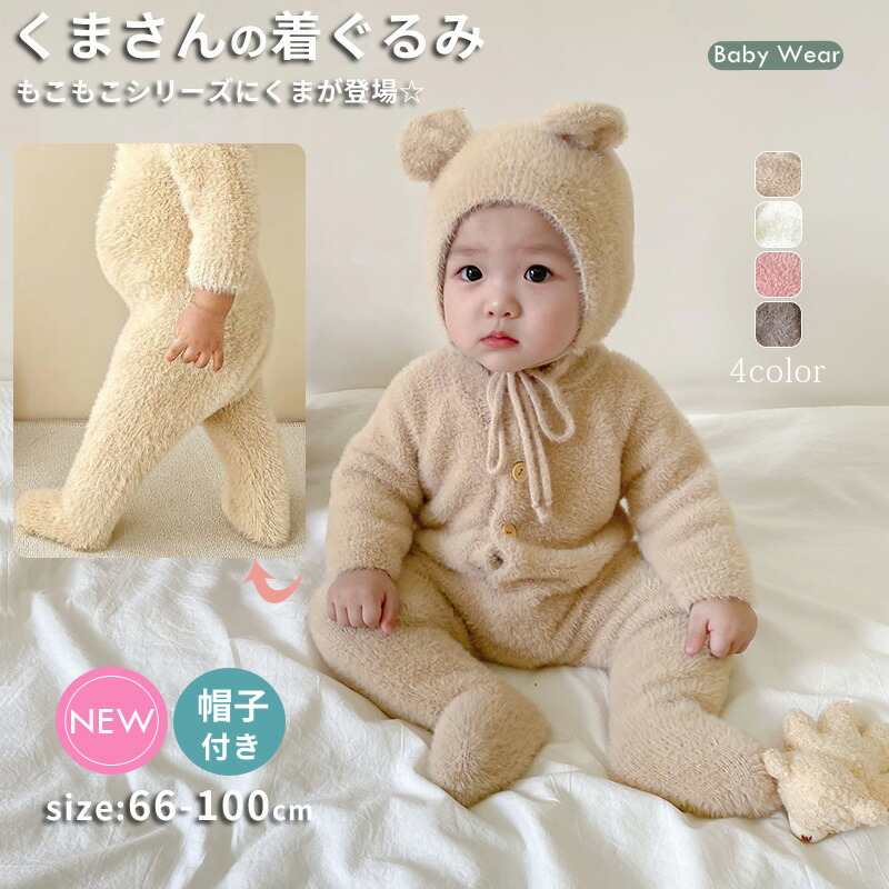 ロンパース くまちゃん 着ぐるみ カバーオール ベビー服 足つき くま耳 ボンネットつき もこもこ キッズ ベビー オールインワン 男の子 女の子 長袖 韓国 服 動物 子供服 赤ちゃん