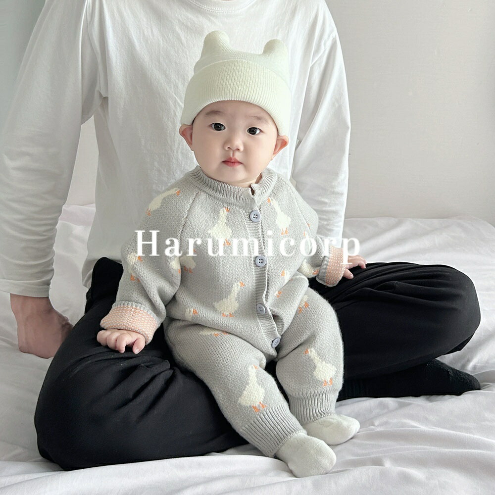 ニット ロンパース アヒル 総柄 新生児 女の子 男の子 ベビー服 カバーオール キッズ 長袖 赤ちゃん 子ども服 可愛い 歩行服 ジャンプスーツ ボタン パジャマ ルームウエア 普 秋冬