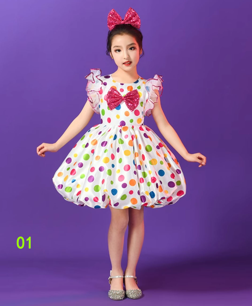 髪飾りの蝶リボン付き 可愛い 子供 ワンピース 半袖 ミドル丈 水玉 スパンコール キラキラ ボリューム ワンピース 合唱 演奏 発表会 舞台 ダンス衣装