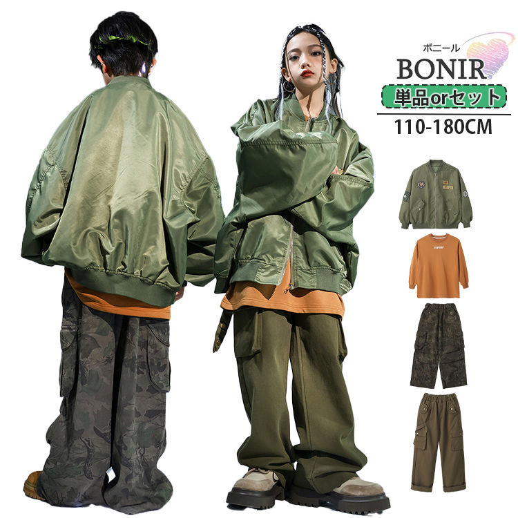 スタジャン 緑 ダンス衣装 キッズ ヒップホップ ストリート系 ジャケット ダボダボ 長袖 カーキ 迷彩パンツ カーキパンツ トレーナー セットアップ 子供服 ゆったり 女 ロングパンツ