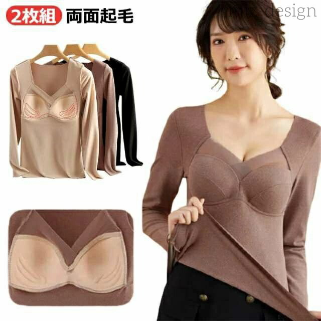 2枚組 カップ付き インナー 長袖 ブラトップ カットソー 両面起毛 暖かい 秋冬 カップ付インナー レディース