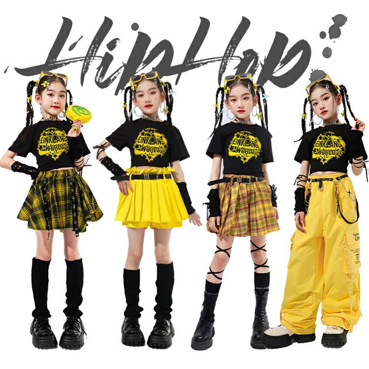 子供服 キッズ ダンス ダンス衣装 女の子 ガールズ イエロー ブラック チェック 半袖 シャツ スカート 長ズボン ダンスウェア 発表会 応援団 イベント ジュニア 普段着 jazz K カッコイイ
