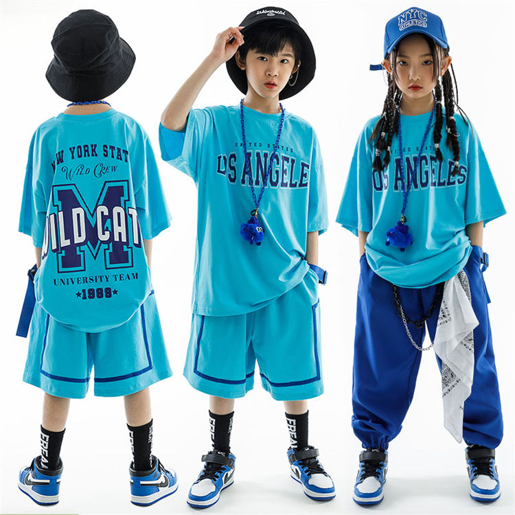 単品とセット対応!半袖 トップス 青系 ヒップホップ ダンス衣装 キッズ 上下セット カッコイイ