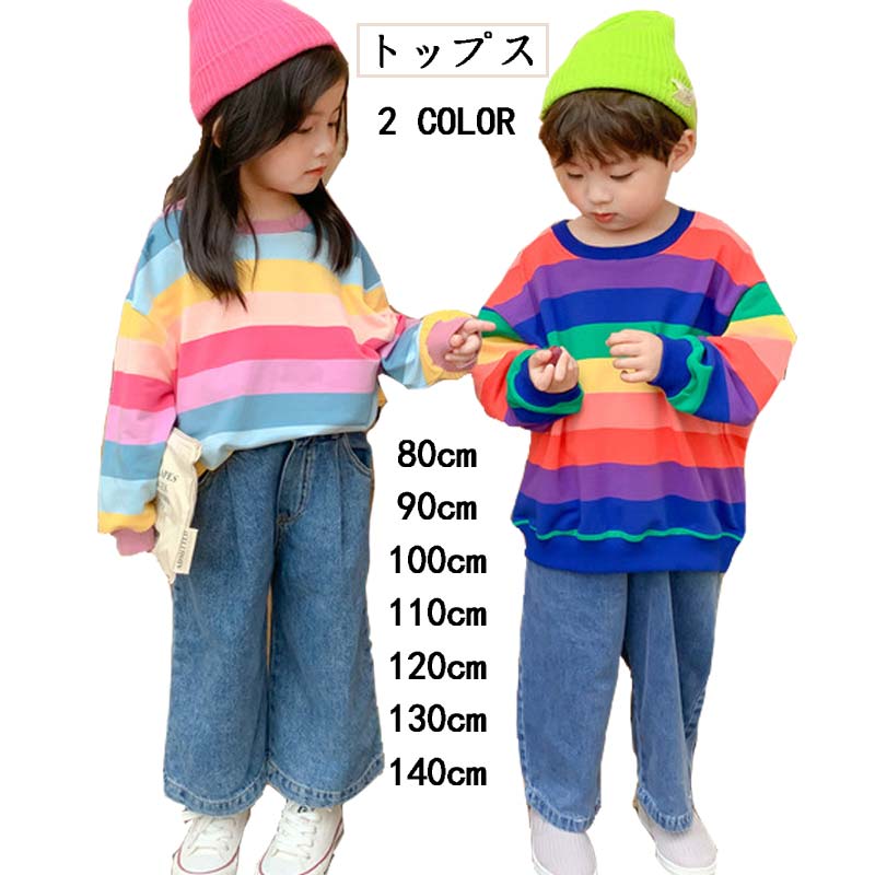 春秋 トップス 子供服 キッズ 女の子 男の子 長袖 カラフルボーダー 韓国子供服 韓国子ども服 クルーネック 2色選択 Tシャツ 長そで こども用 子ども用 可愛い パーカー スウェット お洒落