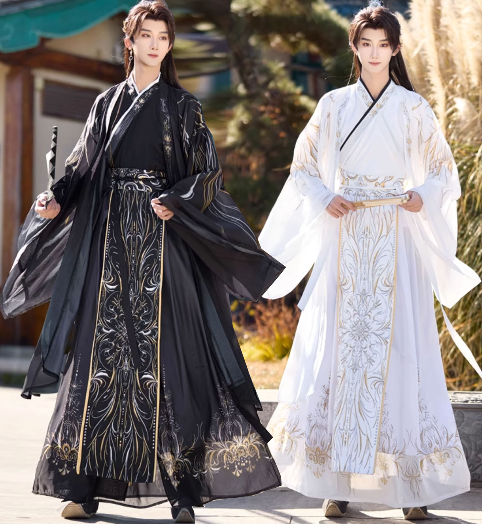 メンズ 漢服 黒 白 広袖羽織カバー付き 3点セット 大人 男性 おしゃれ 暗黒 クール 中華ファンタジー 仙侠 侠客 武侠 神様 コスチューム 金色のプリント 交差襟 飄逸 中国古代服 男女兼用