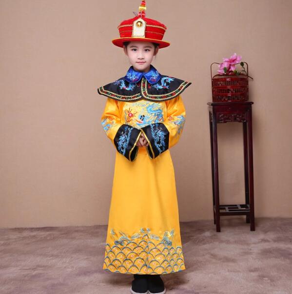 唐装漢服キッズ公演服中華服舞台服装 ステージコスプレ衣装中国古代宮廷風コスプレ衣装 イベント 学園祭パーティーダンス衣装 写真撮影演出服 清朝天子服 皇帝服 帽子つき太子服 子供ダンス服 ローブ