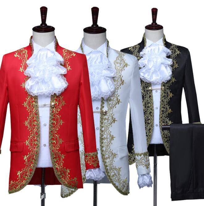 メンズ 礼服4点セット 欧米 宮廷 王子様 コスチューム ステージ衣装 舞台衣装 貴族 伯爵 スーツ 仮装 変装 長袖ジャケット 長ズボン つけ袖 フリルジャボ コスプレ おしゃれ フロ 男性
