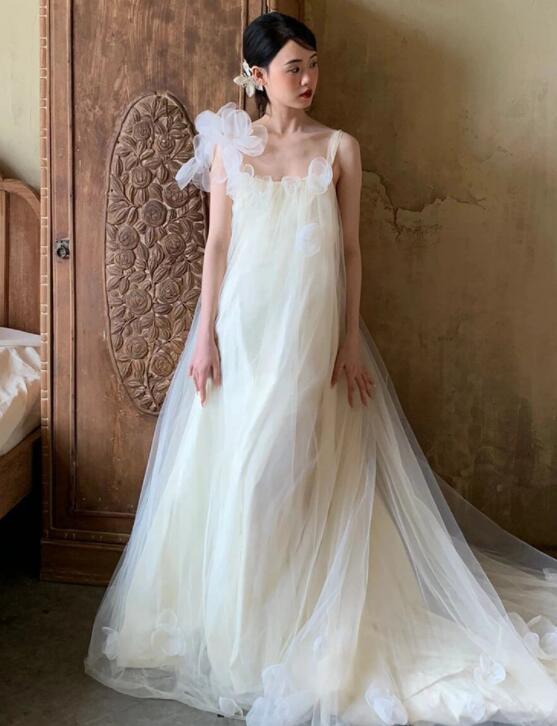 花びら ロング マキシ丈 ウェディングドレス 森ガール系 ゆったり ウエディングドレス ストラップ キャミソール 右肩に造花 フリル 後ろが長い トレーン 裾にお花 ふわふわ 可愛い ドレス