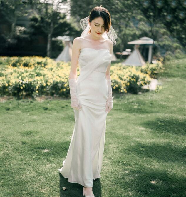 ウェディングドレス 結婚式 パーティードレス 花嫁ドレス 豪華 ロングドレス 司会 発表会 二次会ドレス 白ドレス ベアトップ ホワイト aライン 後ろリボン 韓国 レディースドレス ウ ハイウエスト