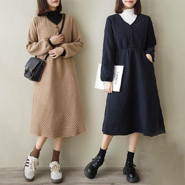 ワンピース ロング丈 レディース 春 秋 冬 中綿 ロング ライン ゆったり 体型カバー カジュアル ロング丈ワンピ 大人 あったか シ 厚手