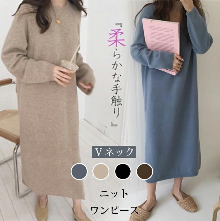 ニットワンピース レディース ワンピース ニット 秋冬 ロング丈 vネック 長袖 厚手 ハイウエスト 着痩せ マタニティ ゆったり きれいめ 無地 セーター おしゃれ