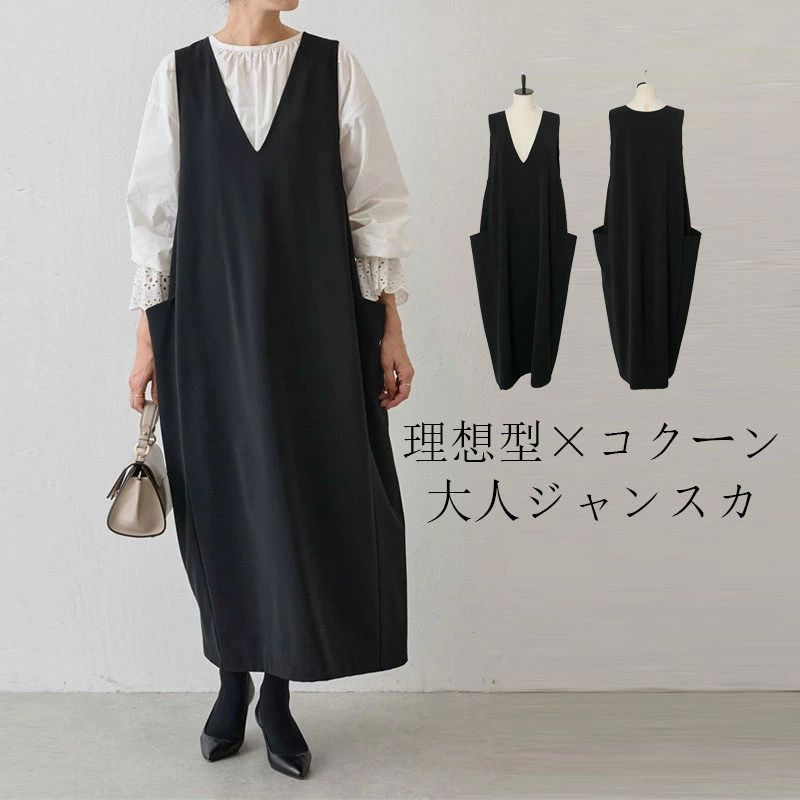 きれいめ ジャンパースカート 大人 vネック ロング 春 夏 秋 ロングワンピース ジャンスカ 大きいサイズ コクー コクーン