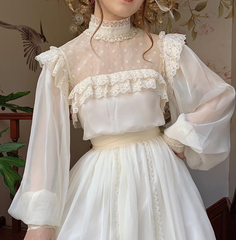 ワンピース ミモレ丈 長袖 パフスリーブ ハイネック 春夏秋向け お姫様 レトロ ヴィンテージ 優しい アイボリー パーティー 二次会 ドレス チュール シフォン ハイウエス レースフリル