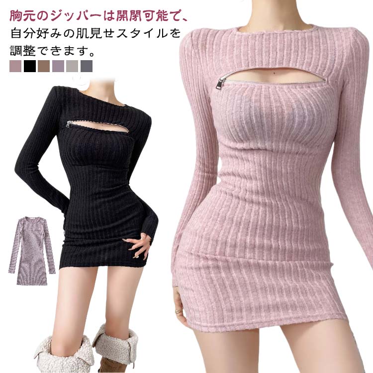 胸あき セクシー リブ ニット ミニ ワンピース タイト 秋 冬 ジッパー ジップ 長袖 チャック 胸開き ミニワンピ ミニ丈 タイトワンピース スリーブ ワンピ レディース ロング