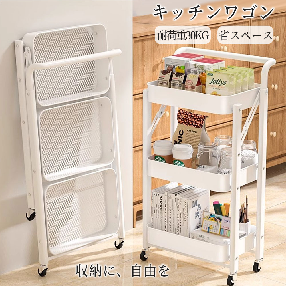 キッチンワゴン キャスター付き スリム 折り畳み式ワゴン ラック 3段 収納ラック 幅46×奥行29.5×高さ87cm バスケットトローリー バスケットラック キッチンラック 隙間収納 収納 ハンドル