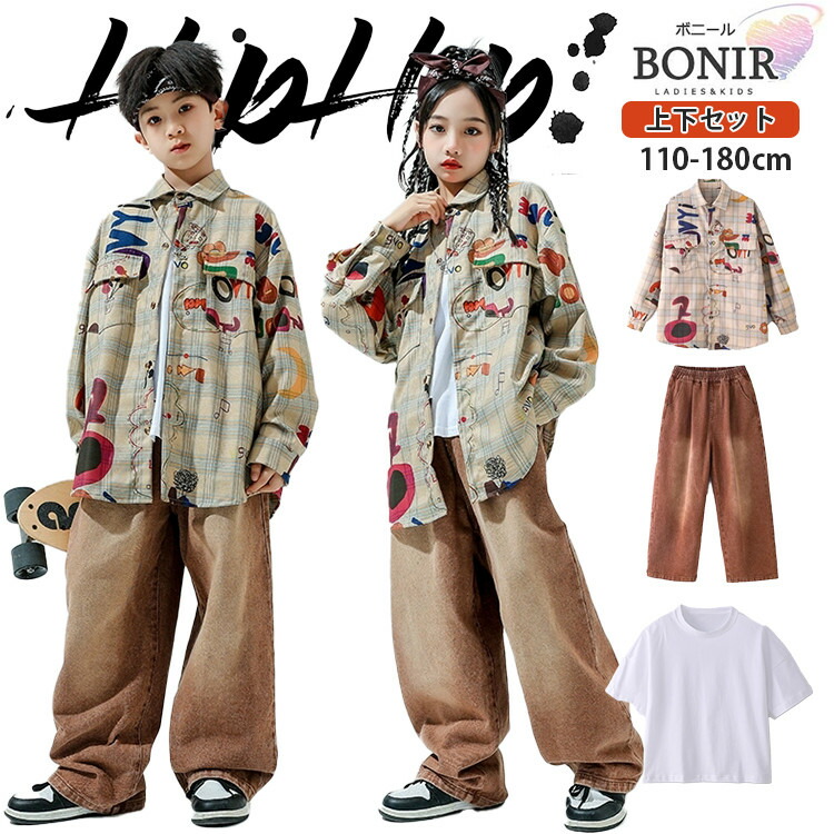 ベージュ キッズダンス ダンス衣装 ヒップホップ 女の子 男の子 ギンガムチェック 長袖 花 動物 柄シャツ 白 Tシャツ ブラウン カーゴパンツ デニムパンツ ジャッズ 普段着 団体服 ストリート