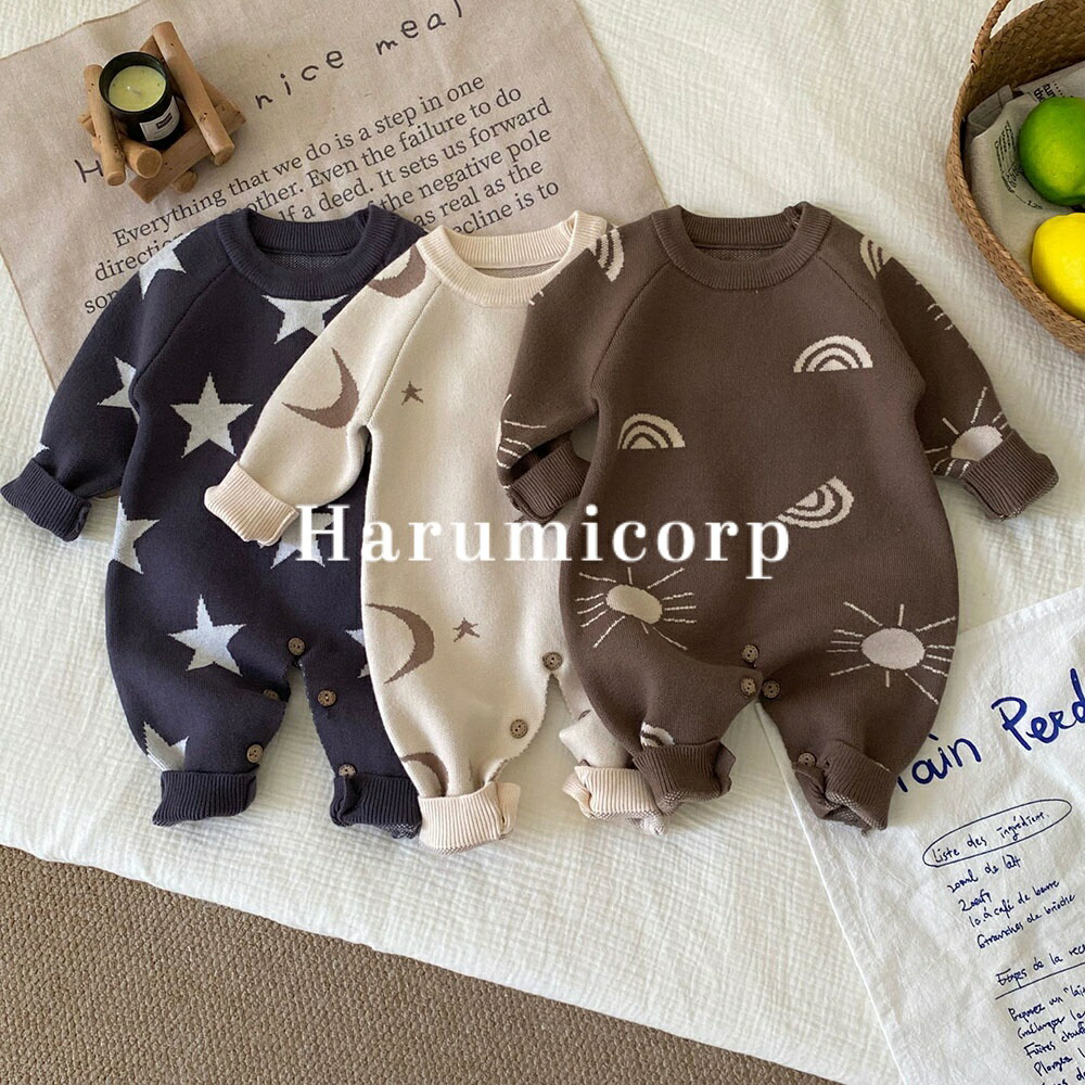 ニット ロンパース 太陽 月 星 総柄 新生児 女の子 男の子 ベビー服 カバーオール キッズ 長袖 赤ちゃん 子ども服 可愛い 歩行服 ジャンプスーツ 秋冬 パジャマ ルームウエ ボタン