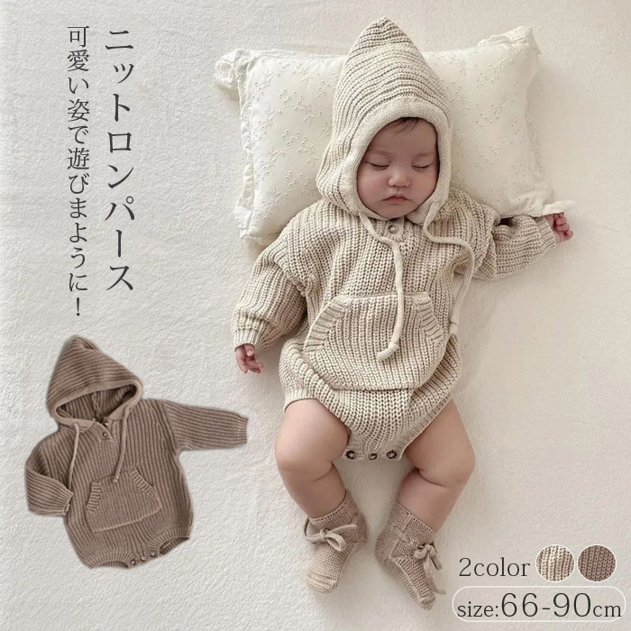 ベビー ニットロンパース 長袖 ベビー服 女の子 男の子 カバーオール キッズ 赤ちゃん 新生児 出産祝い ロンパース 退院着 かわいい シンプル ナチュラル フード付き 73 80 90cm 66