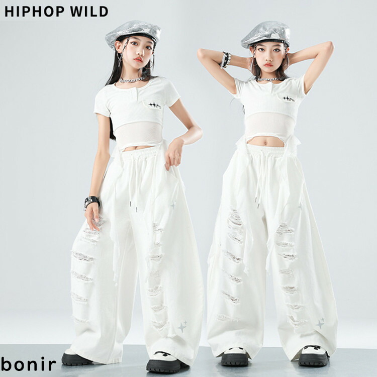 白 キッズ ダンス衣装 女の子 ダメージ ワイドパンツ Y2K 韓国 ヒップホップ ジャズ 半袖 トップス へそ出し セットアップ 子供服 演出服 発表会 応援団 レッスン着 ジュニア カ 団体服