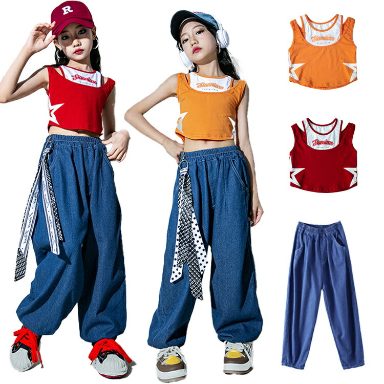 橙 赤 レッド オレンジ トップス キャミソール ネイビー デニムパンツ ジーンズ キッズ ダンス衣装 子供服 韓国 ストリート 練習着 演出 舞台 派手 パンツ 110-180
